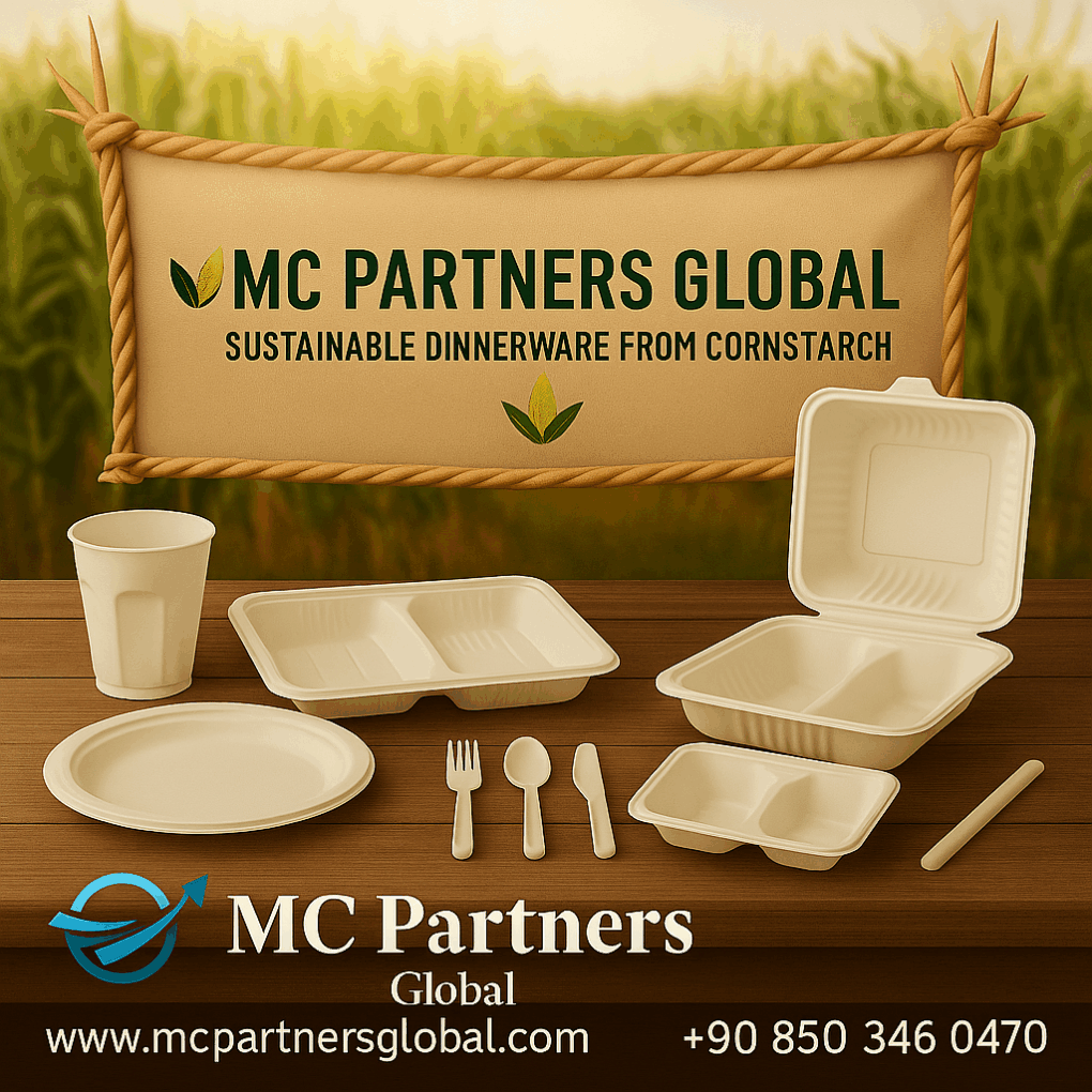 MC Partners Global, tamamen biyobozunur, organik ve plastik içermeyen mısır nişastası tabak, bardak, kase, çatal–kaşık–bıçak ve gıda kapları sunar.